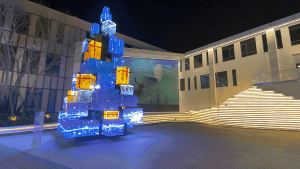 为了更好地展示未来区域的核心商业氛围,设计团队在场地中设计了一个高约8米、由大小不一的正方体构成礼物山形式的“潮BOX”。礼物山可以通过不同的屏幕展示出整体统一的画面,其屏幕覆盖率高达80%以上。当感应到参观者时,便会触发互动机制,根据交互者的手势在画面上有所变幻。
